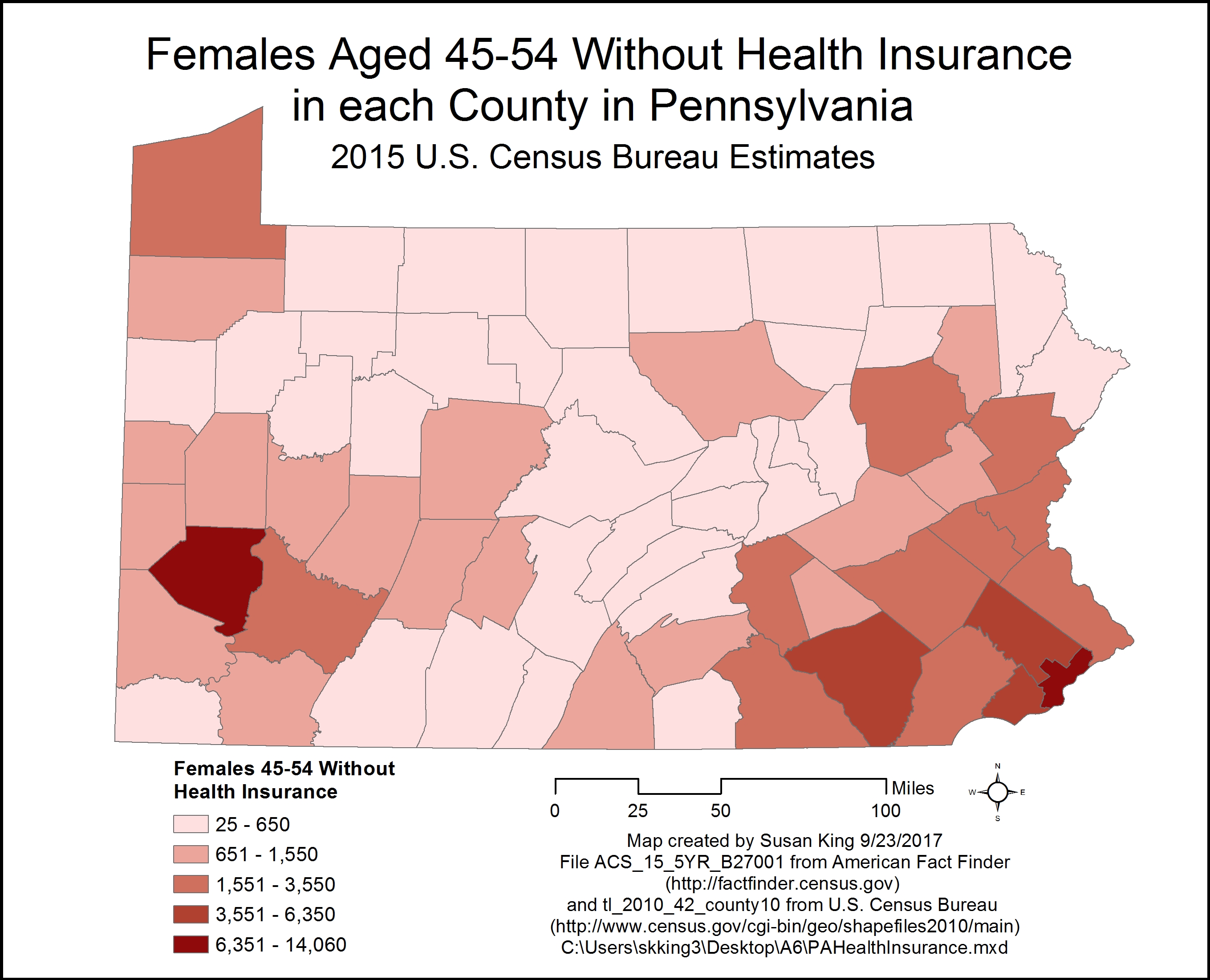 Problem: The Office of State Human Resources has requested a map showing the number of females aged 45-54 without health insurance in each county in Pennsylvania.