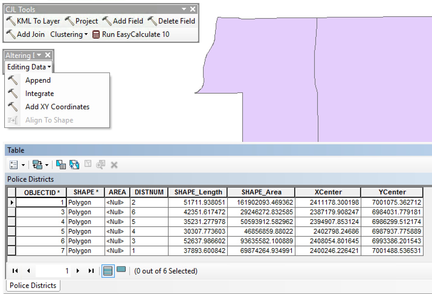 Fig. 2. Toolbars showing tools (upper left) and menus (middle left) that have been placed in the ArcMap interface. Attribute table shows results of running the EasyCalc tool to locate the center (XCenter and YCenter) of a polygon. Click on image for larger version.