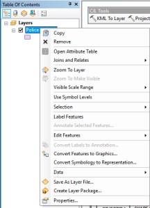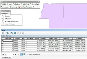 Strategies and Methods: I will use Arc Map (version 10.5.1) and its Customize Mode to create new toolbars, using the Customize, New Menu, and Context Menu features. I began by using the Customize mode to create a new toolbar, and the Commands tab to search for the desired tools to drag and drop into the new toolbar. I added a new menu to the toolbar and named it appropriately, and then dragged and dropped the desired tools to the menu. I repeated this process to create the second desired toolbar. I downloaded the EasyCalc add-in and installed that to ArcMap, and then added its tool to the desired toolbar. To add the desired tool to the Feature Layer Context Menu I found the desired tool in the Layer category in the commands tab, and dragged and dropped that to the appropriate location. I saved my customizations to the map document and tested the tools; this included using the EasyCalc tool to find the center of the police district polygons (Fig. 1).