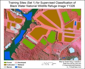Problem: You need to classify the land cover of one aerial image of the Black Water National Wildlife Refuge in order to develop a methodology for creating land cover data for the entire refuge. You need to identify the following six land cover classes: forest, cultivated field, barren area, developed/impervious, wetland, and water.
