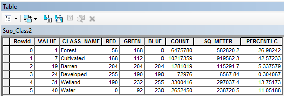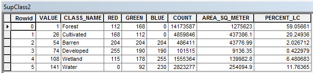 Table 1. Attribute tables showing the area (AREA_SQ_METER) and percent of total land cover (PERCENT_LC) for each class of land cover from the first supervised classification (top) and revised supervised classification (bottom).