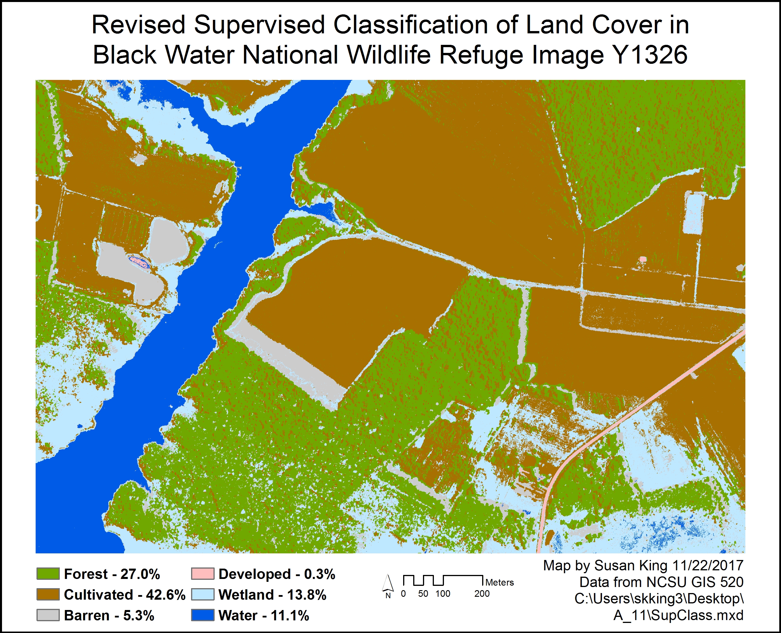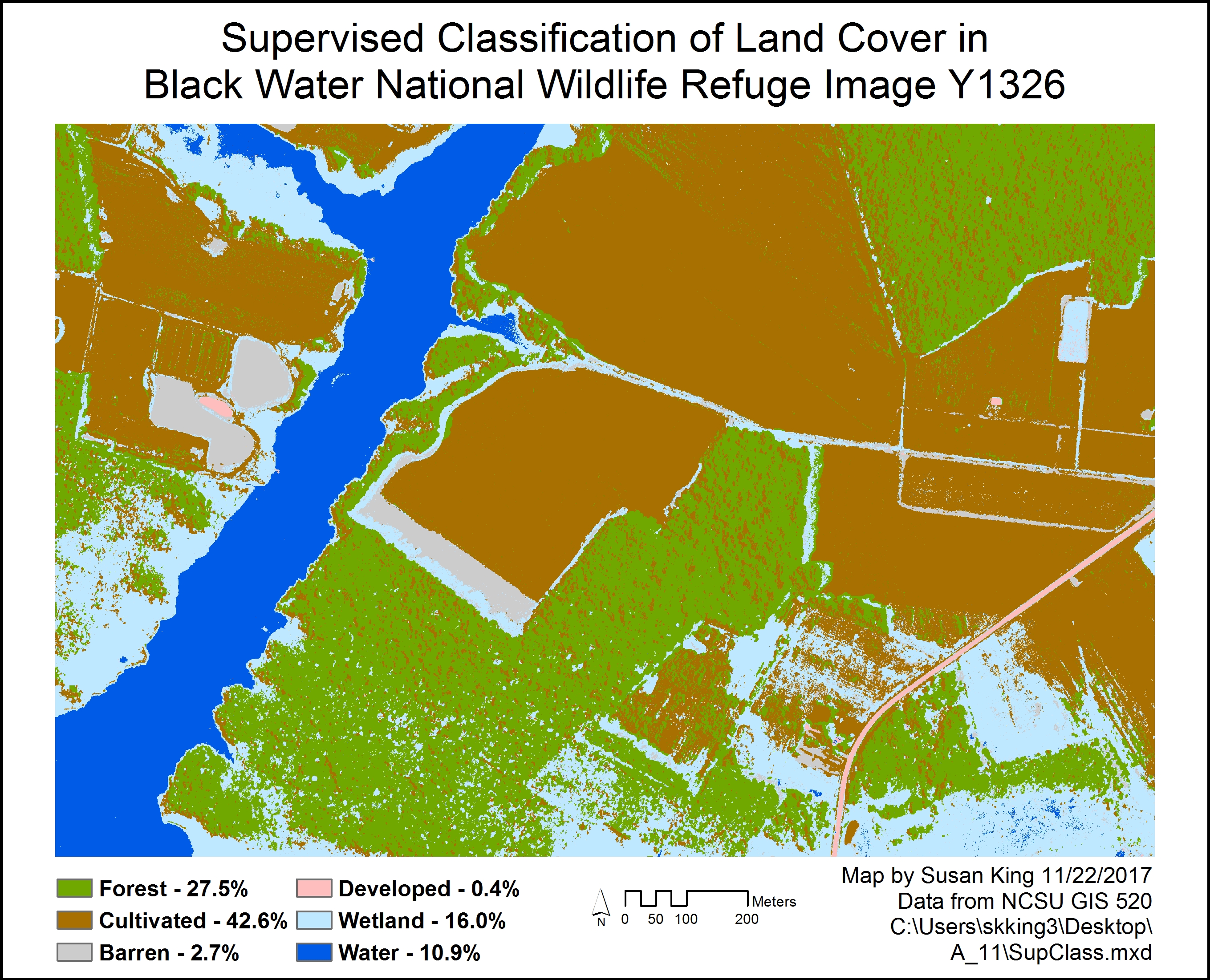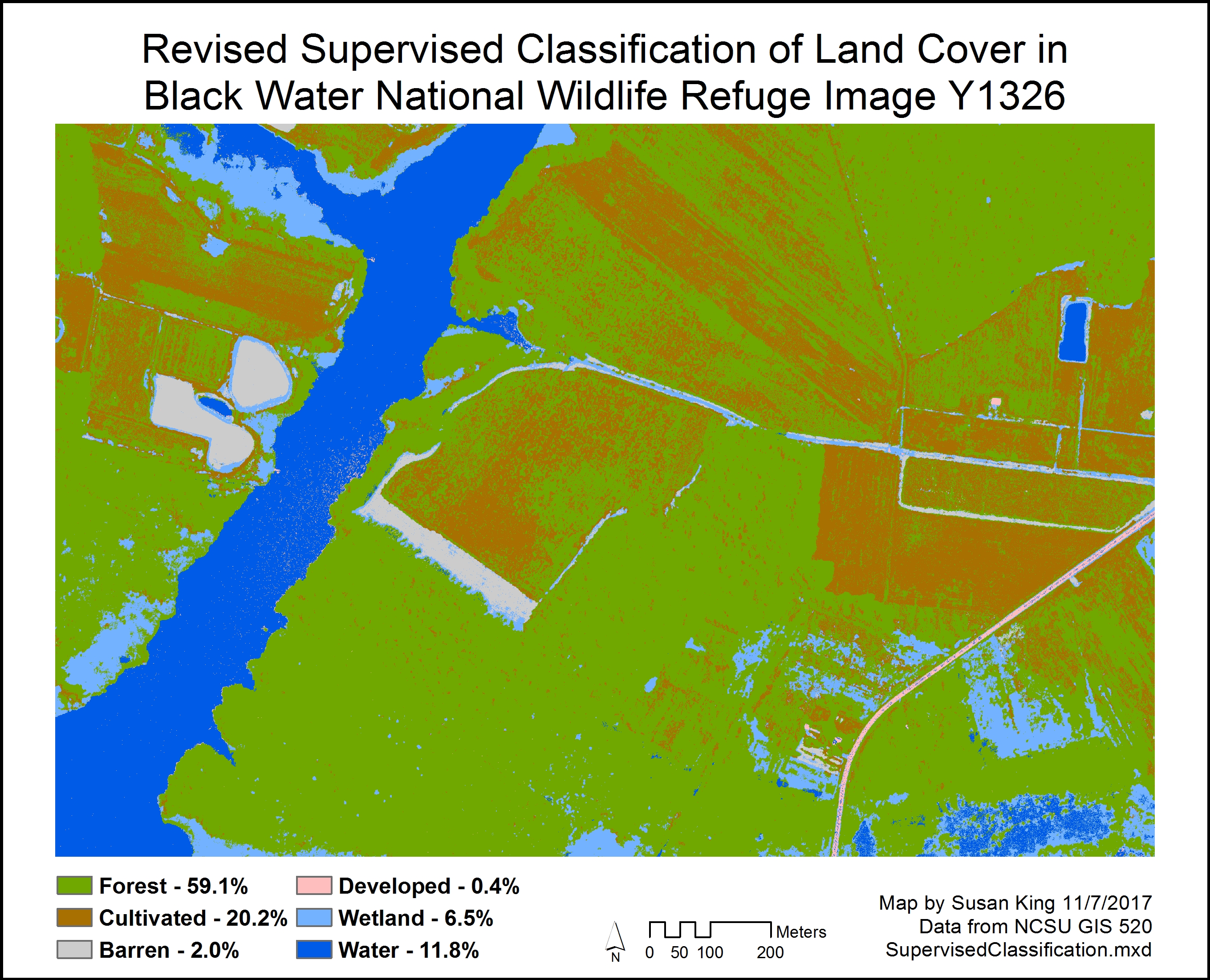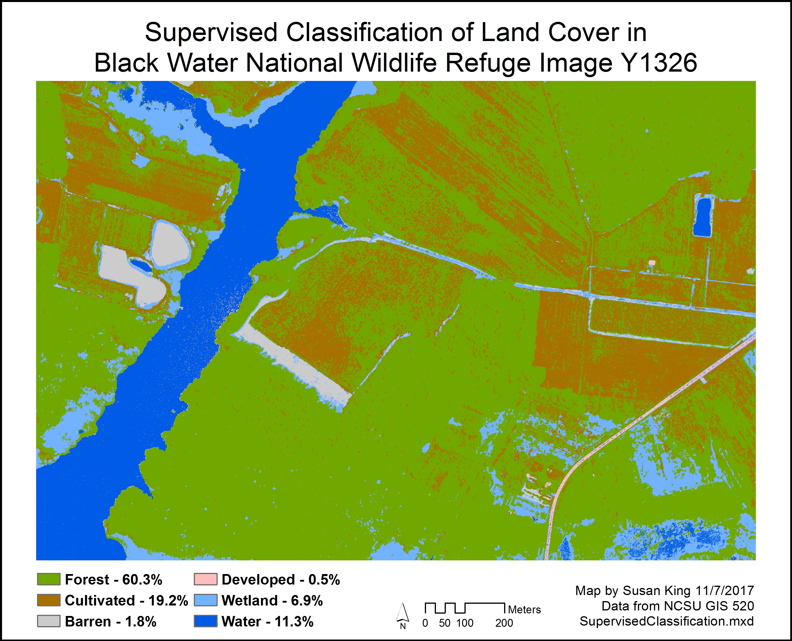 Problem: You need to classify the land cover of one aerial image of the Black Water National Wildlife Refuge in order to develop a methodology for creating land cover data for the entire refuge. You need to identify the following six land cover classes: forest, cultivated field, barren area, developed/impervious, wetland, and water.
