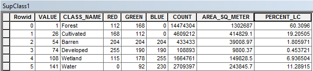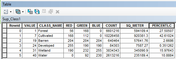 Table 1. Attribute tables showing the area (AREA_SQ_METER) and percent of total land cover (PERCENT_LC) for each class of land cover from the first supervised classification (top) and revised supervised classification (bottom).
