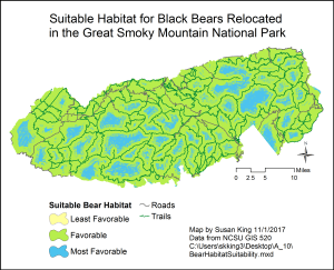 Problem: I have been tasked with locating suitable habitat for Black Bears in the Great Smoky Mountains National Park, so that wildlife biologists can relocate bears that have come into contact with humans with the goal of reducing future human-bear interactions.